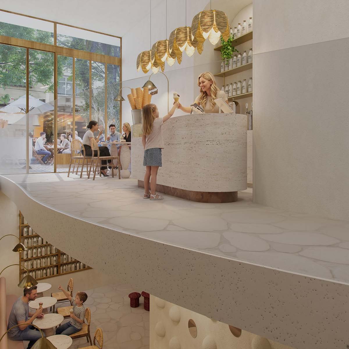Trabalho e conveniência:coworking, biblioteca temática, minimercado e espaço delivery.