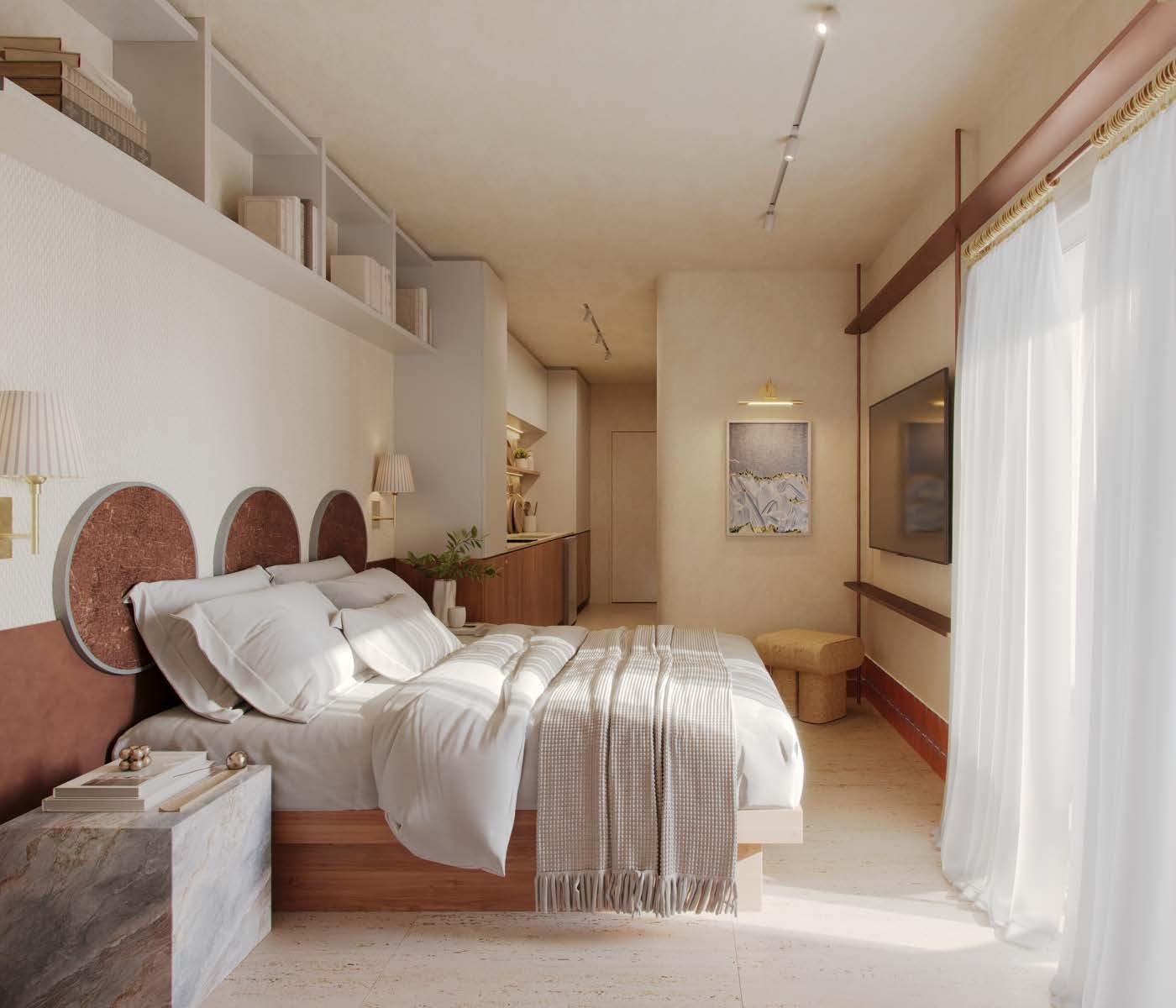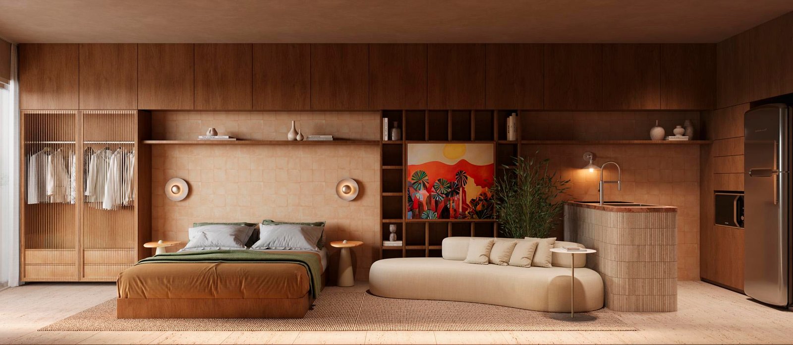 Studios: máxima eficiência espacial; layout que comporta dormitório e living integrados.