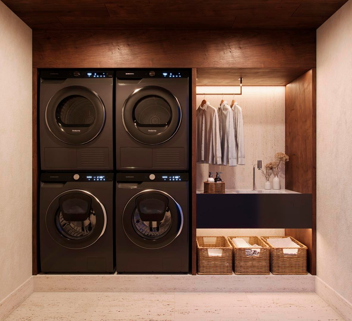 Lavanderia compartilhada que libera espaço interno nas unidades.