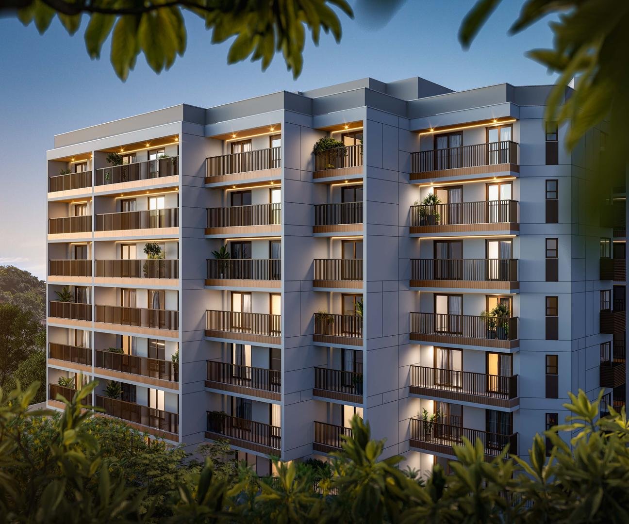 Studios de 30 a 43 m² e aptos de 45 a 106 m², até 3 quartos, com integração de ambientes e luz natural. Arquitetura a+ arquitetura e interiores Manga Rosa valorizam design, natureza e funcionalidade.