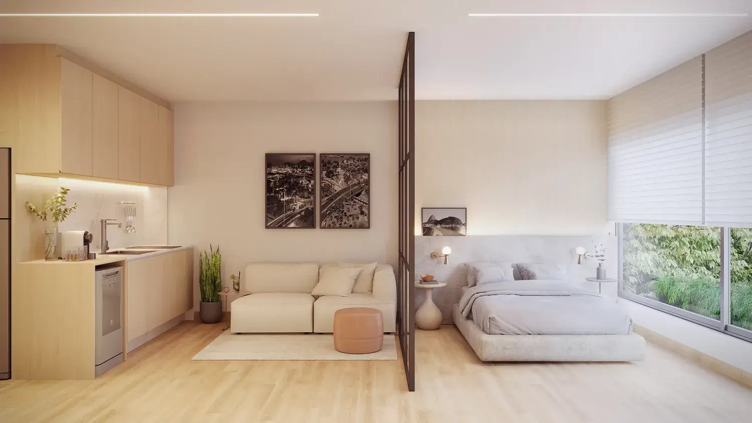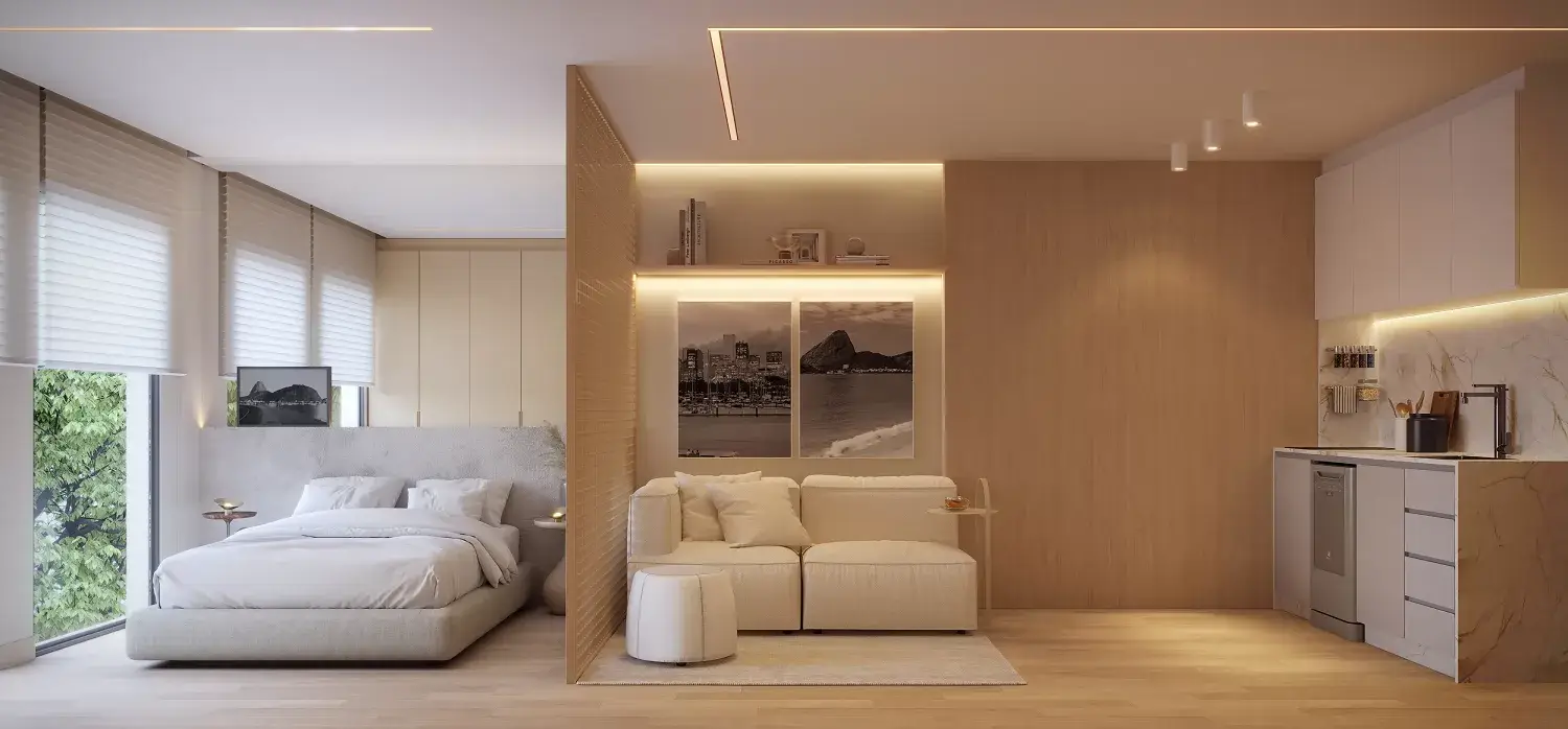 Studios com metragens compactas e layouts otimizados.