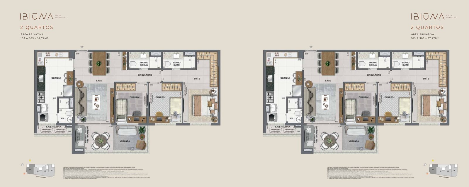 Plantas Inteligentes e Eficientes – Tipologias de 2 quartos com 1 ou 2 suítes, com configuração que equilibra circulação interna e espaços de convivência integrados.
