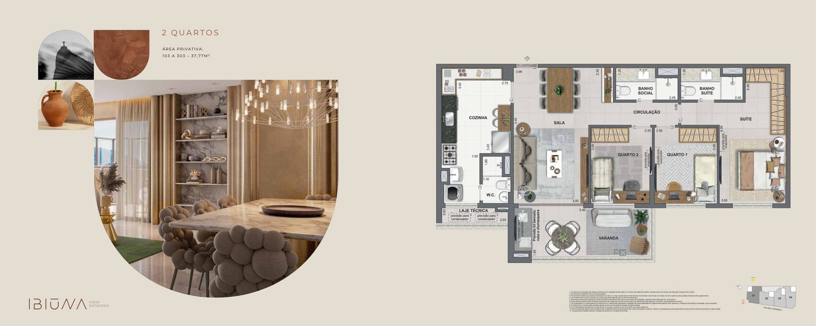 Quer clareza antes de comparar? Aqui está o que o Ibiuna Vista Botafogo oferece hoje em produto: apartamentos de 2 quartos (com 1 ou 2 suítes), varanda gourmet e plantas tipo, garden e cobertura, com áreas privativas entre 73 m² e 152 m². O material de lançamento informa ainda vaga de garagem e comunicação forte com a vista para o Cristo Redentor nas varandas. Trata-se de um lançamento da Dimensional Engenharia na Rua Real Grandeza, em Botafogo.