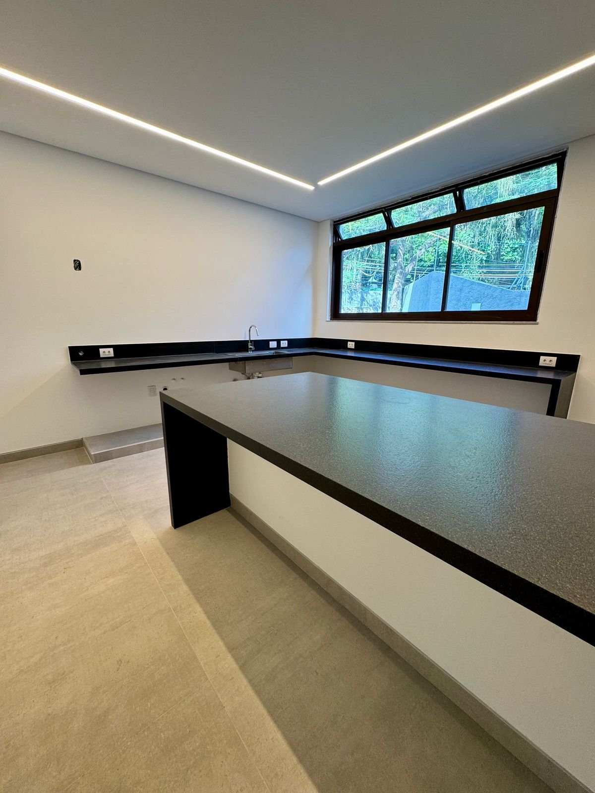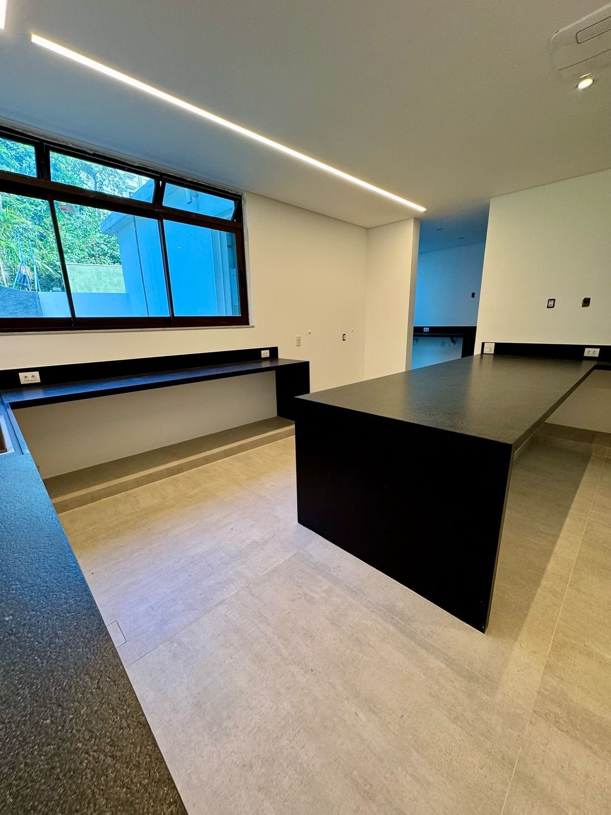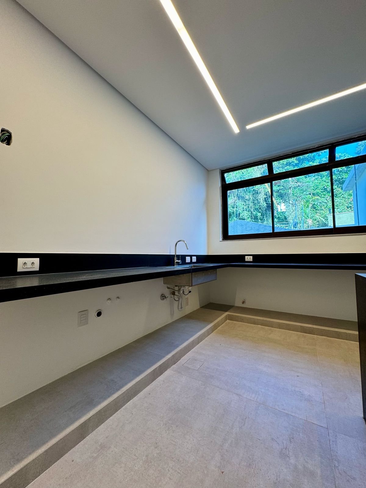 Cozinha ampla com design contemporâneo e dependência completa de serviço