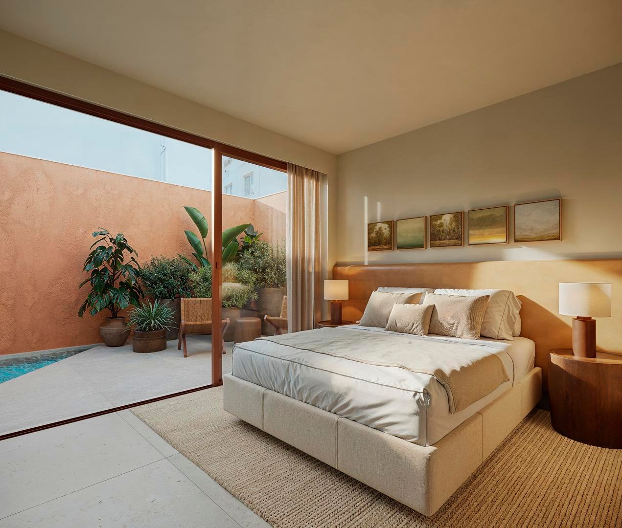 Unidades garden, com áreas variando de 63 m² a 69 m², que agregam áreas externas privativas e, em alguns casos, piscina exclusiva, aproximando a experiência de morar em uma casa de vila, porém com segurança de condomínio.