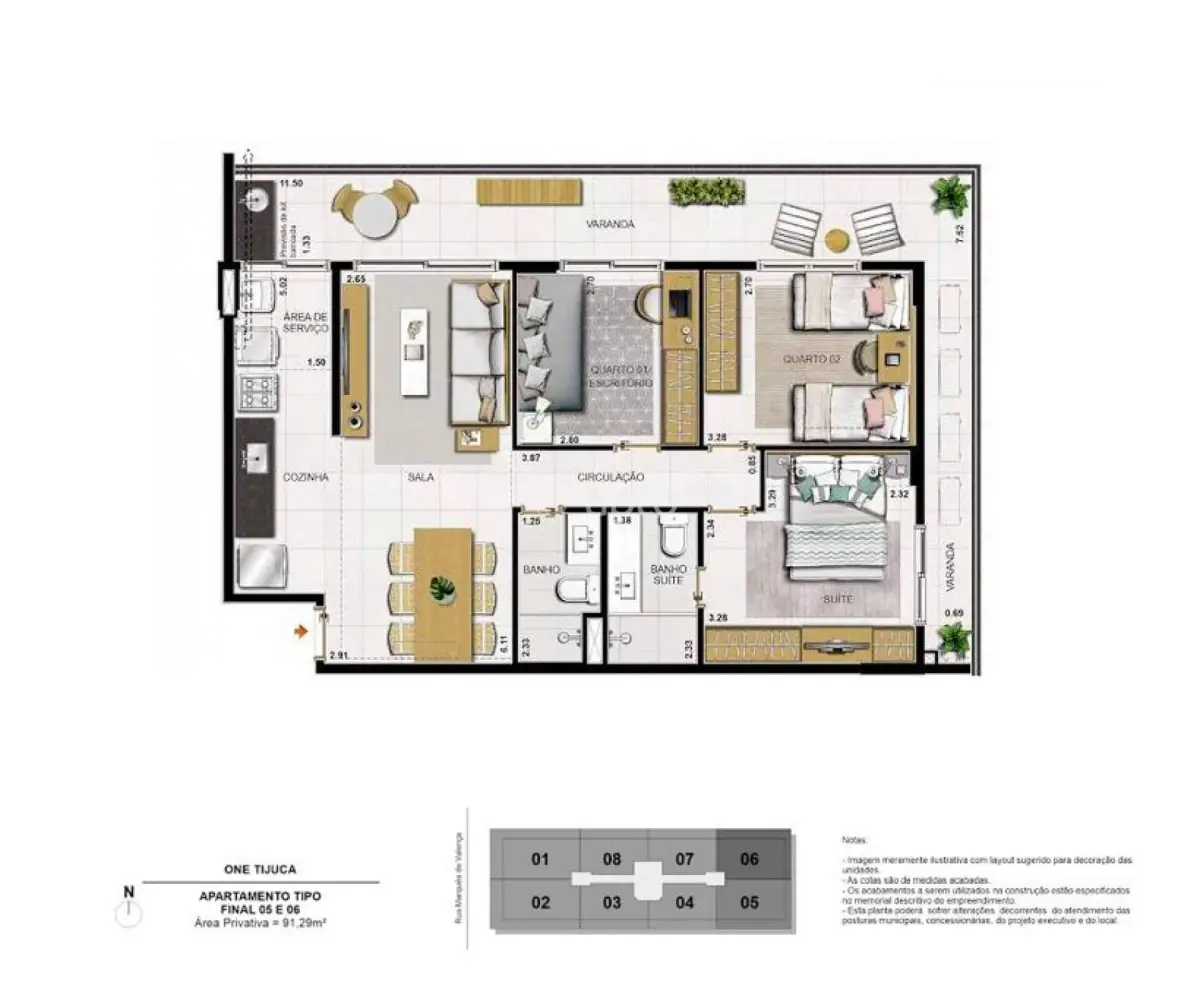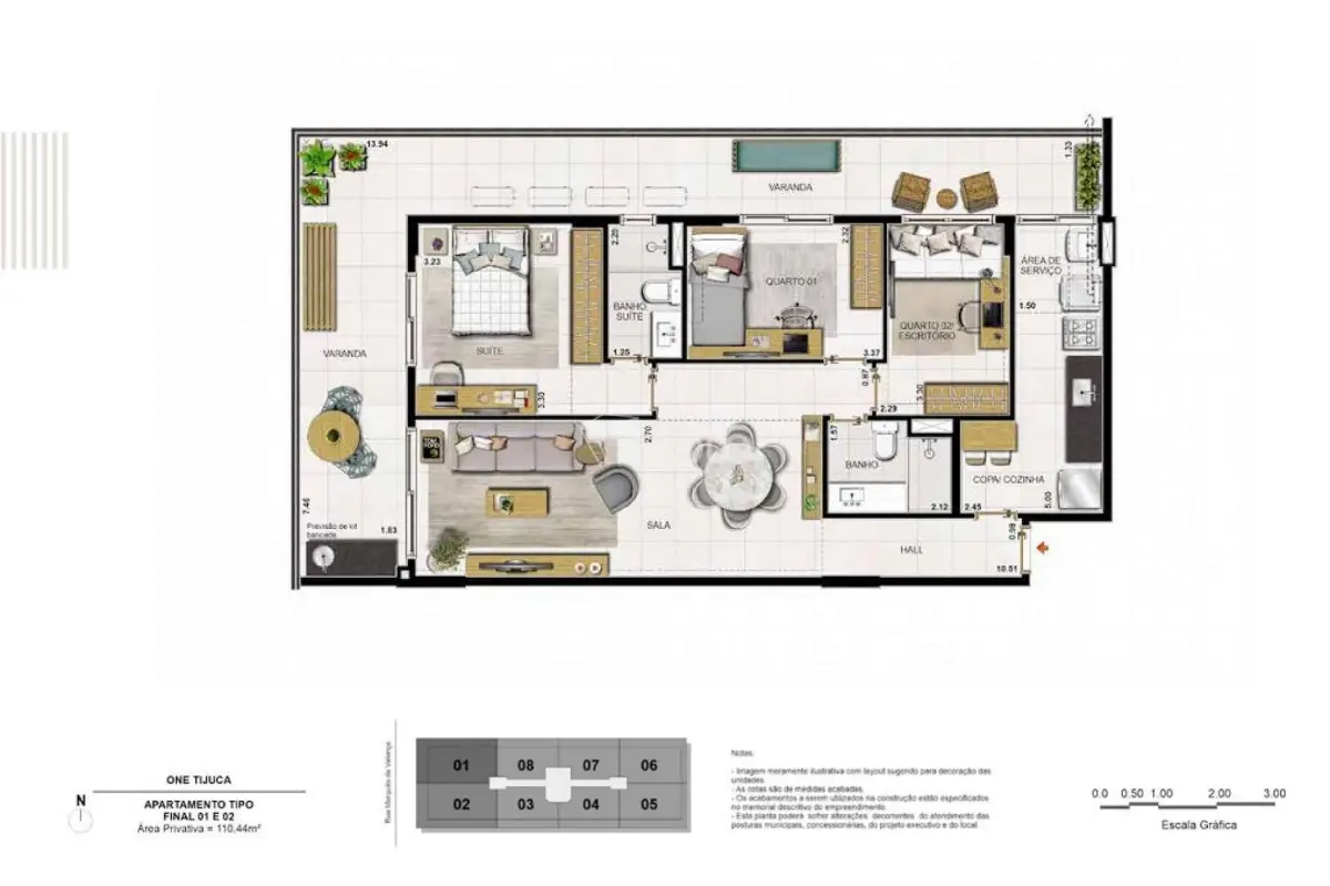 Com metragens que variam entre 67 m² e 110 m², os apartamentos tipo do One Tijuca oferecem opções com 2 ou 3 quartos, sendo todas as tipologias equipadas com 1 suíte, varanda gourmet, 1 vaga na garagem e possibilidade de integração de ambientes com cozinha fechada ou integrada à sala, ampliando significativamente a sensação de amplitude e liberdade de layout.
