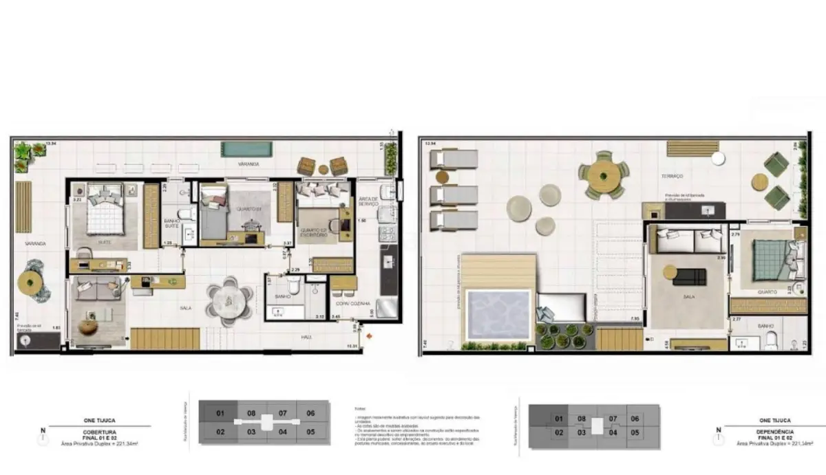 Os diferenciais das coberturas do One Tijuca são evidentes desde a planta. Além da varanda gourmet com churrasqueira a carvão, as unidades contam com opção de integração da cozinha com a sala, criando ambientes mais abertos, sofisticados e funcionais. O pavimento superior foi projetado para abrigar áreas de lazer privativas, com circulação confortável e aproveitamento total da luz natural.