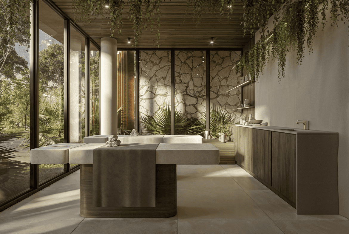A experiência de bem-estar também é amplificada com a presença da renomada rede de academias Companhia Athletica, responsável por assinar o espaço fitness do condomínio. O ambiente conta com equipamentos de ponta, além de aulas personalizadas e programas completos de treinamento físico. Já no quesito relaxamento, o spa assinado pela Saison integra técnicas avançadas de cuidados corporais com um cenário sofisticado e sereno.