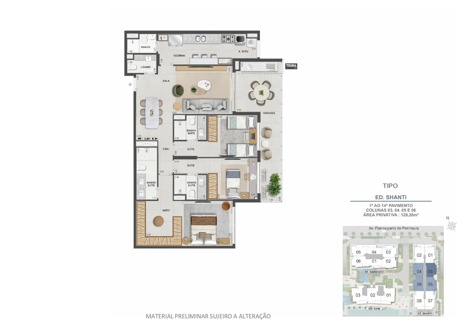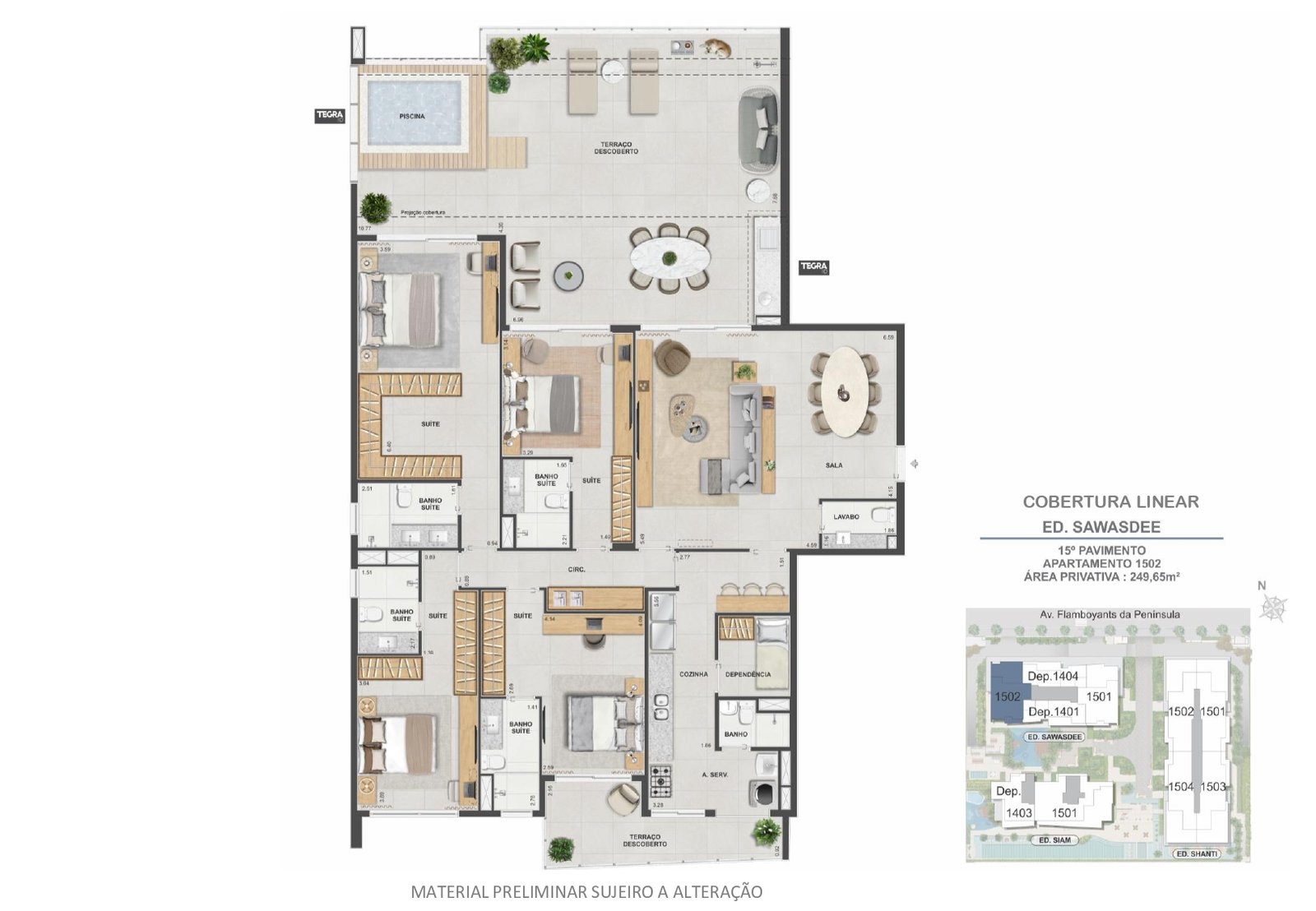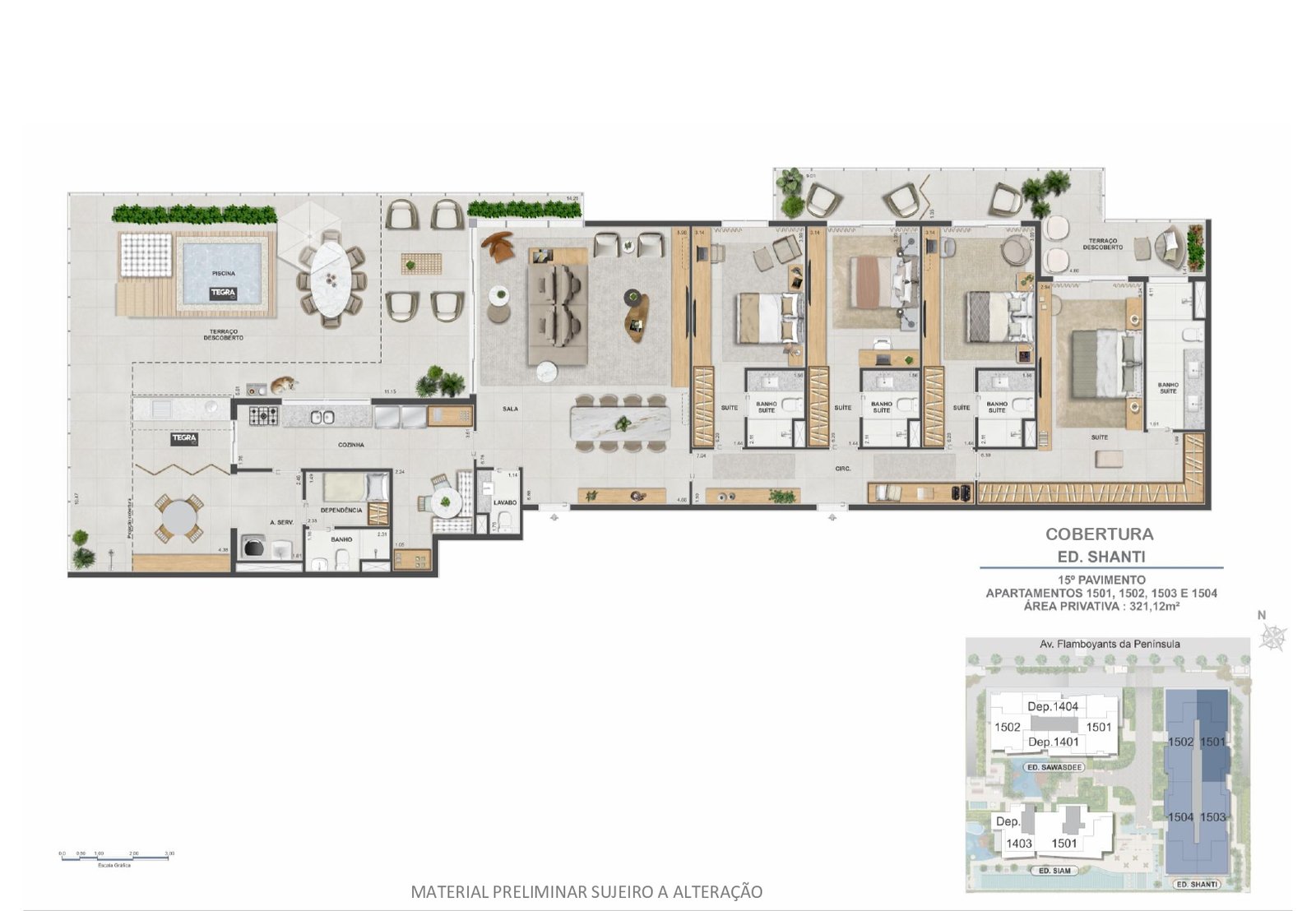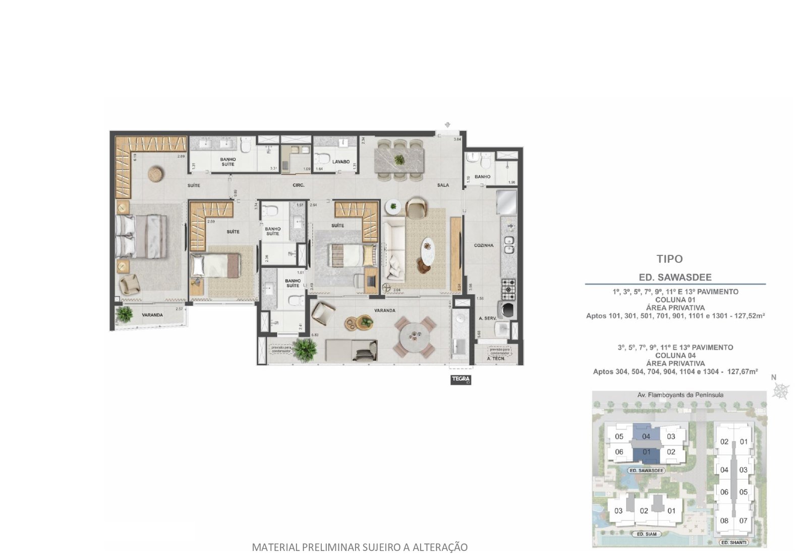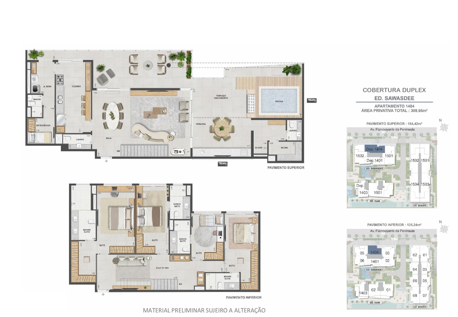 As imagens do Península Collection by Tegra retratam a essência de um projeto de luxo, exclusividade e sofisticação. Cada detalhe dos ambientes, das áreas de lazer ao paisagismo, foi pensado para transmitir a experiência de viver no melhor da Barra da Tijuca. As plantas revelam tipologias que variam de 127 a 405 m², com 3 a 4 suítes, 2 a 3 vagas, incluindo gardens de 165 a 224 m² e coberturas de até 405 m². Essa diversidade garante opções ideais para diferentes perfis, sempre com acabamentos de alto padrão e integração sala–varanda gourmet.