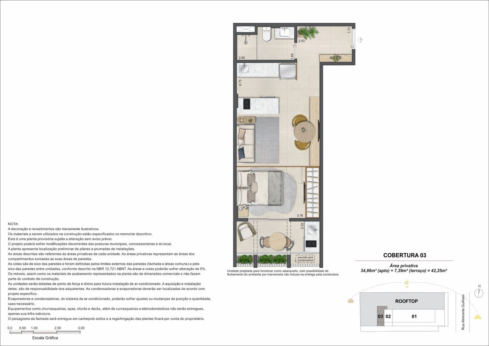 As unidades são distribuídas em studios (33 m² a 35 m²), double studios (63 m² a 69 m²), gardens (até 73 m²) e coberturas duplex (53 m² a 65 m²), todas com design contemporâneo e integração inteligente de ambientes.