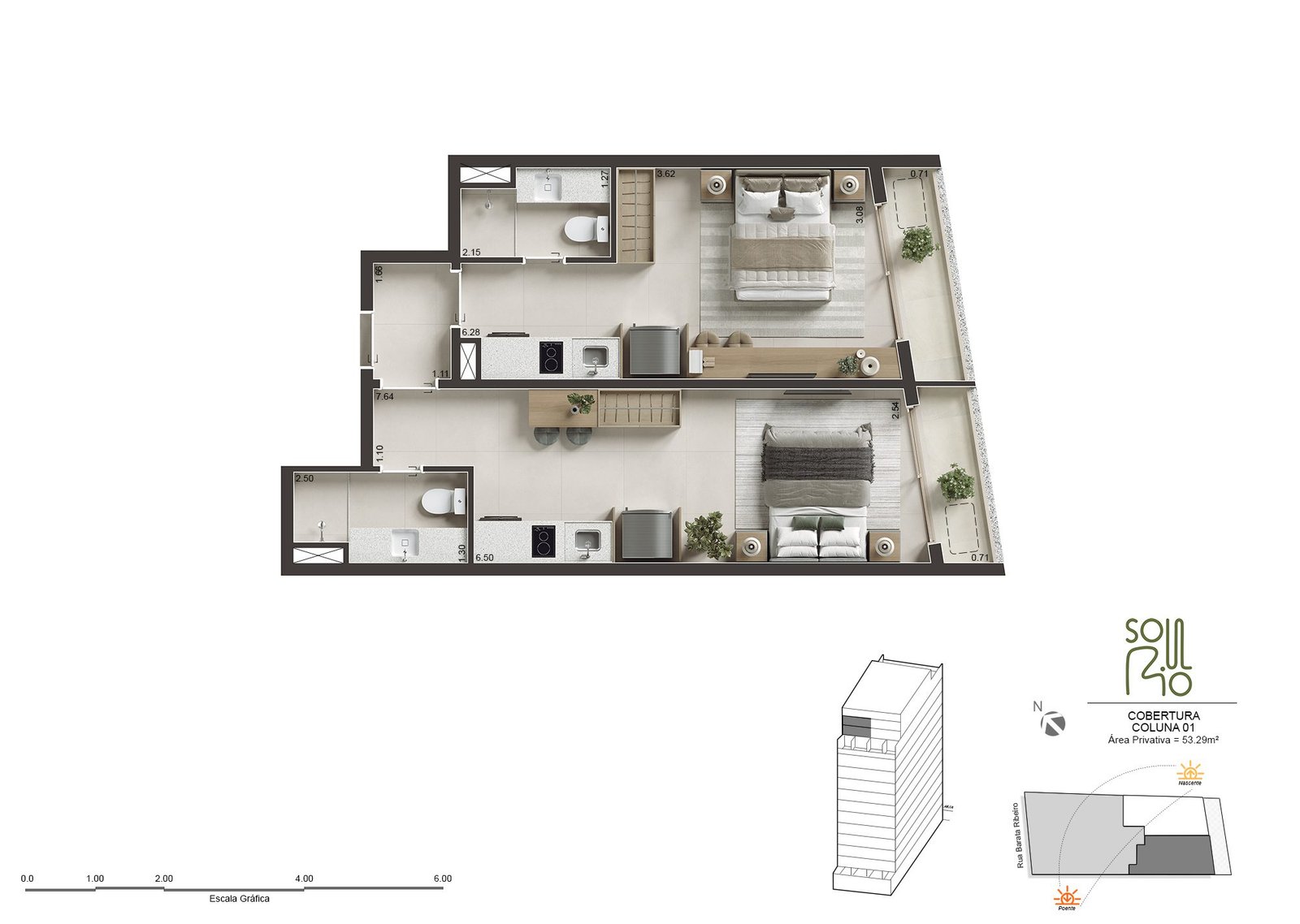 Coberturas Duplex – Entre 53 m² e 65 m², com layout diferenciado que une sofisticação e exclusividade.